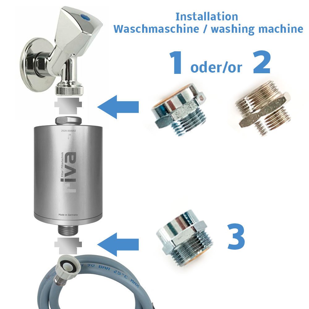 Mit diesem 3-teiligen Set kannst du ganz einfach einen riva Wasserfilter an der Waschmaschine anschließen: