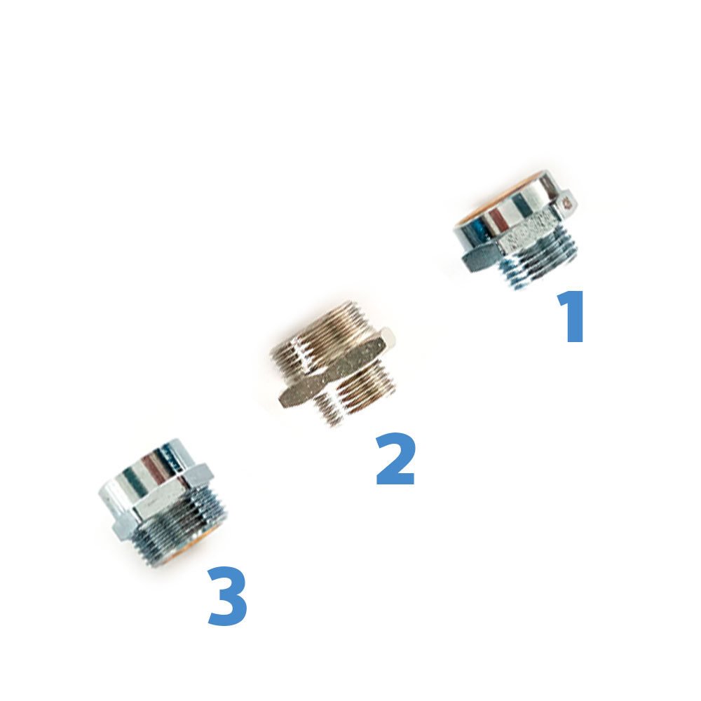 1. Reduzierstück ½“ AG x ¾“ IG flachdichtend (AG= Außengewinde, IG= Innengewinde)